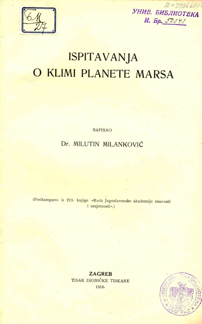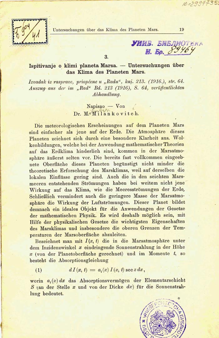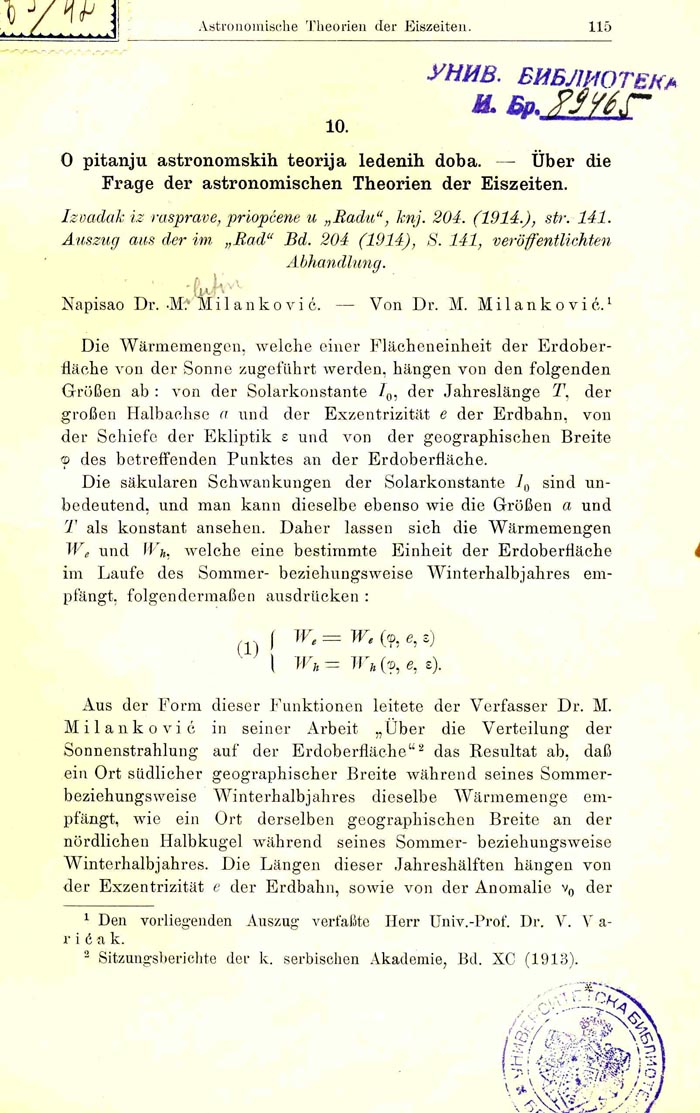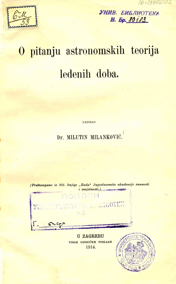 професору Бечке високе техничке школе, ментору и великом пријатељу. Професор Чубер је успео преко својих веза да Миланковић буде пуштен из логора и да заробљеништво проведе у Будимпешти са свим грађанским правима, укуључујући и право на рад. Једино је имао обавезу да се не удаљава из града и да се недељно јавља управи полиције. Добио је и препоруке за управника библиотеке у Мађарској академији наука, математичара који му је дозволио да користи библиотеку и ван радног времена. То је искористио да проучи из доступне светске литературе све аспекте осунчавања Земље и расподелу сунчеве радијације на површини Земље и да напише више радова